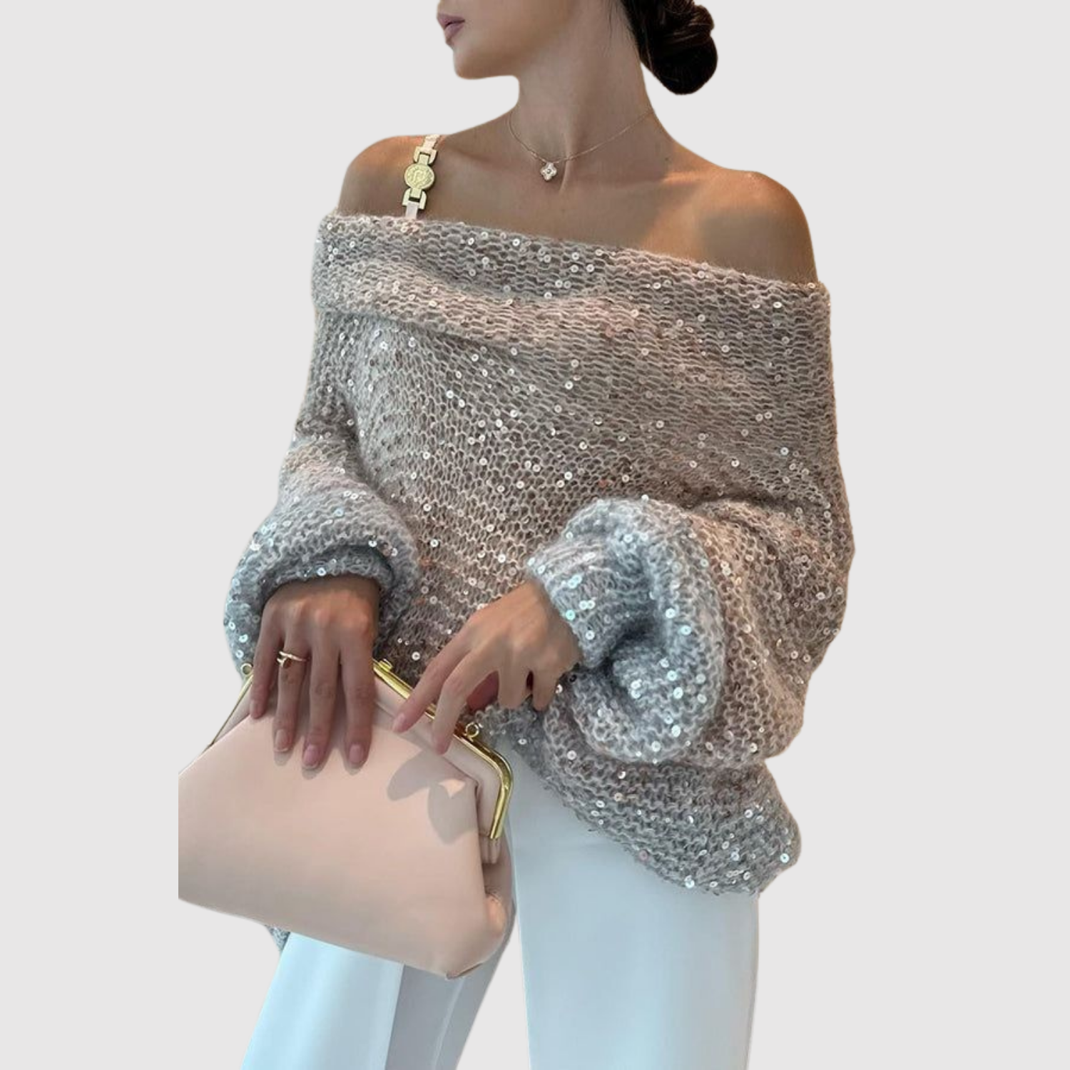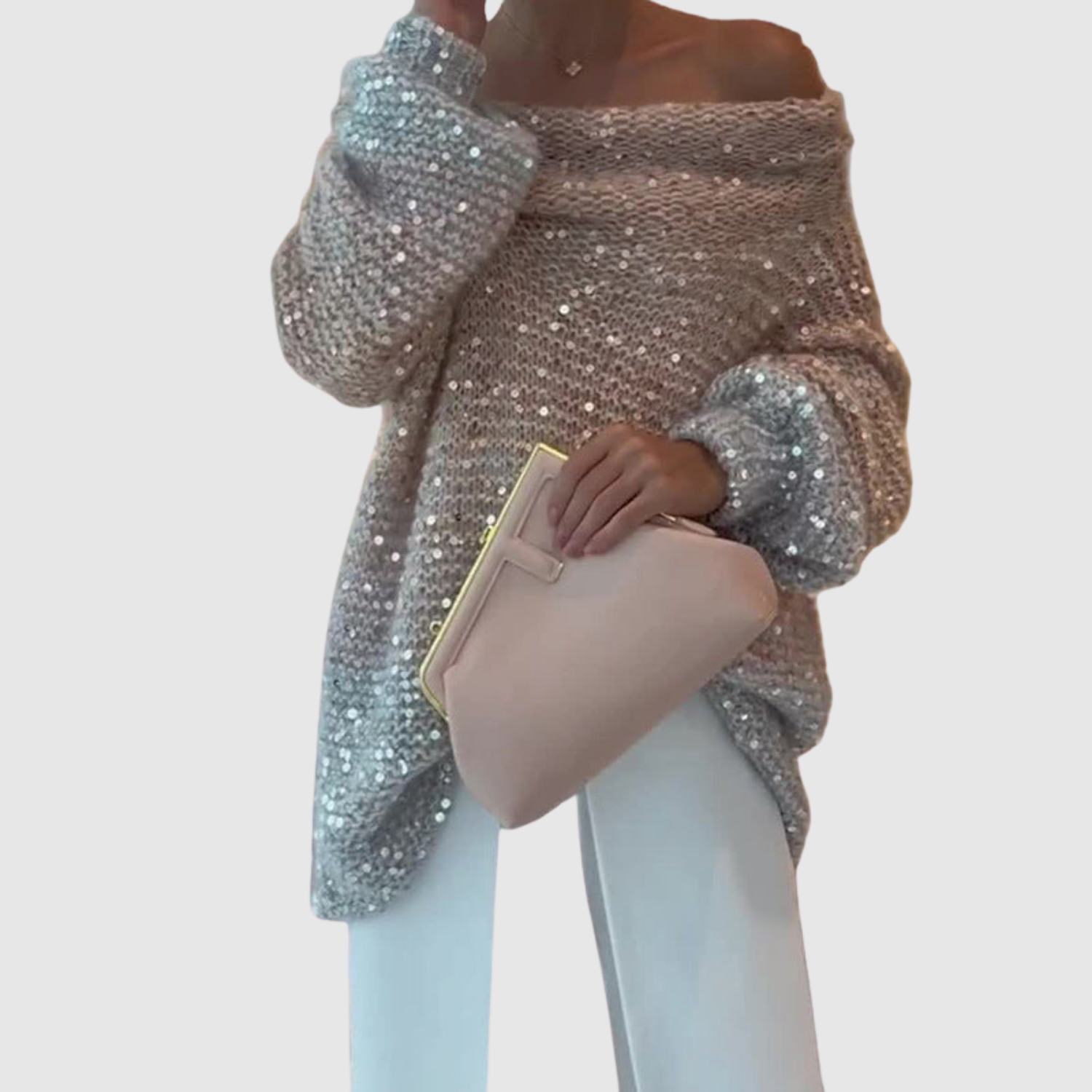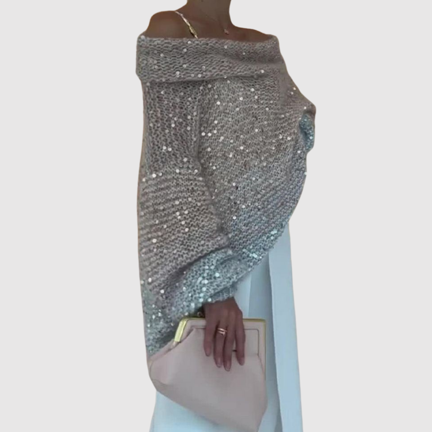 Nora – Błyszczący sweter z odkrytym ramieniem