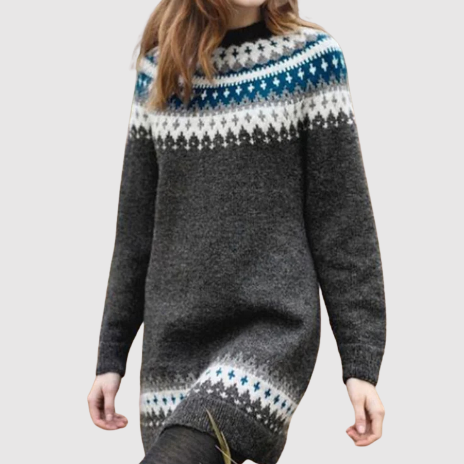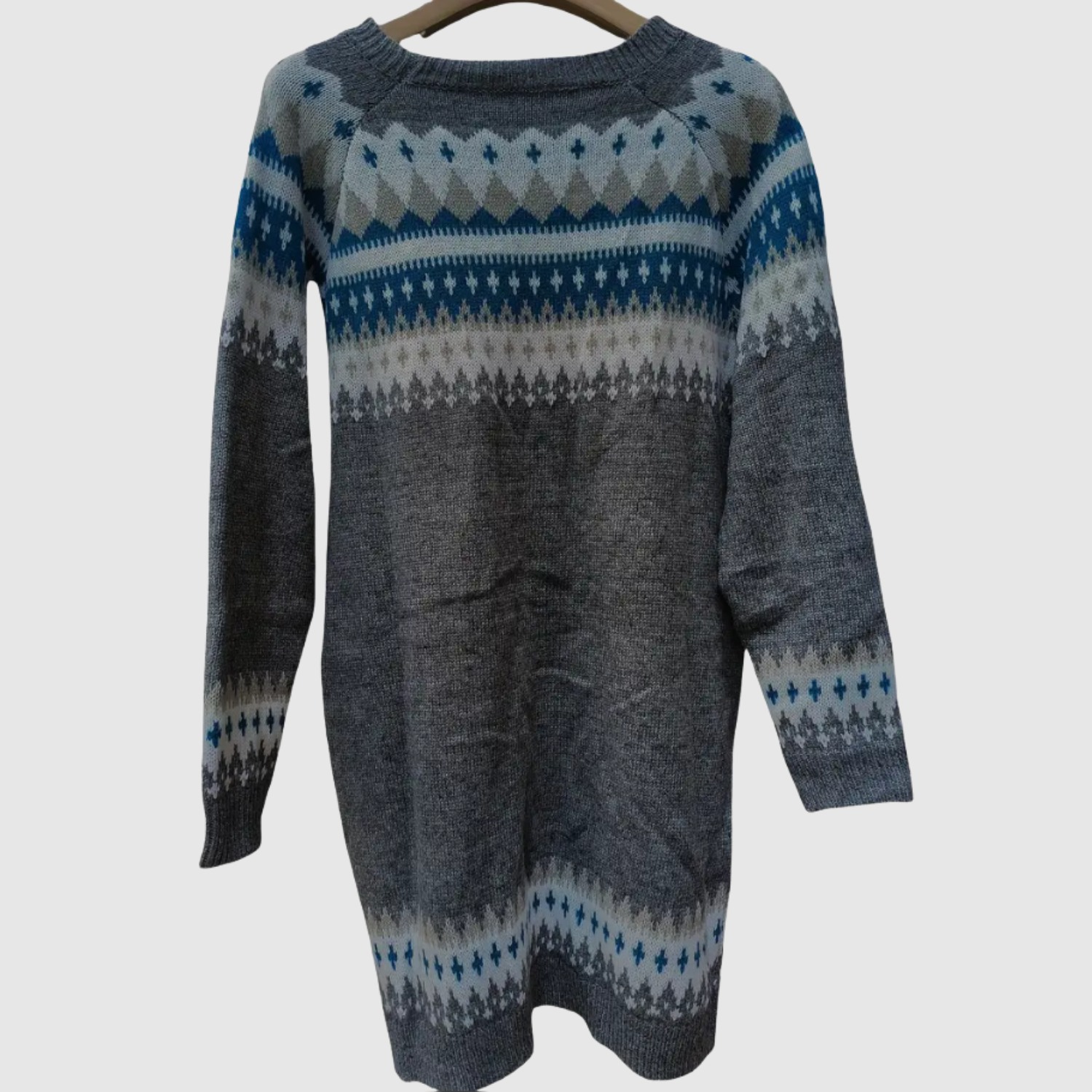 Ten długi sweter to doskonałe połączenie komfortu i nowoczesnego zimowego designu. Wykonany z miękkiego i ciepłego materiału, oferuje uczucie przytulności podczas chłodnych dni. Delikatny nordycki motyw w niebieskim i białym dodaje świeżego akcentu na eleganckim ciemnym tle.