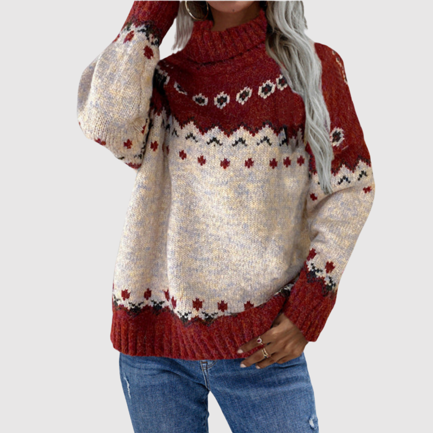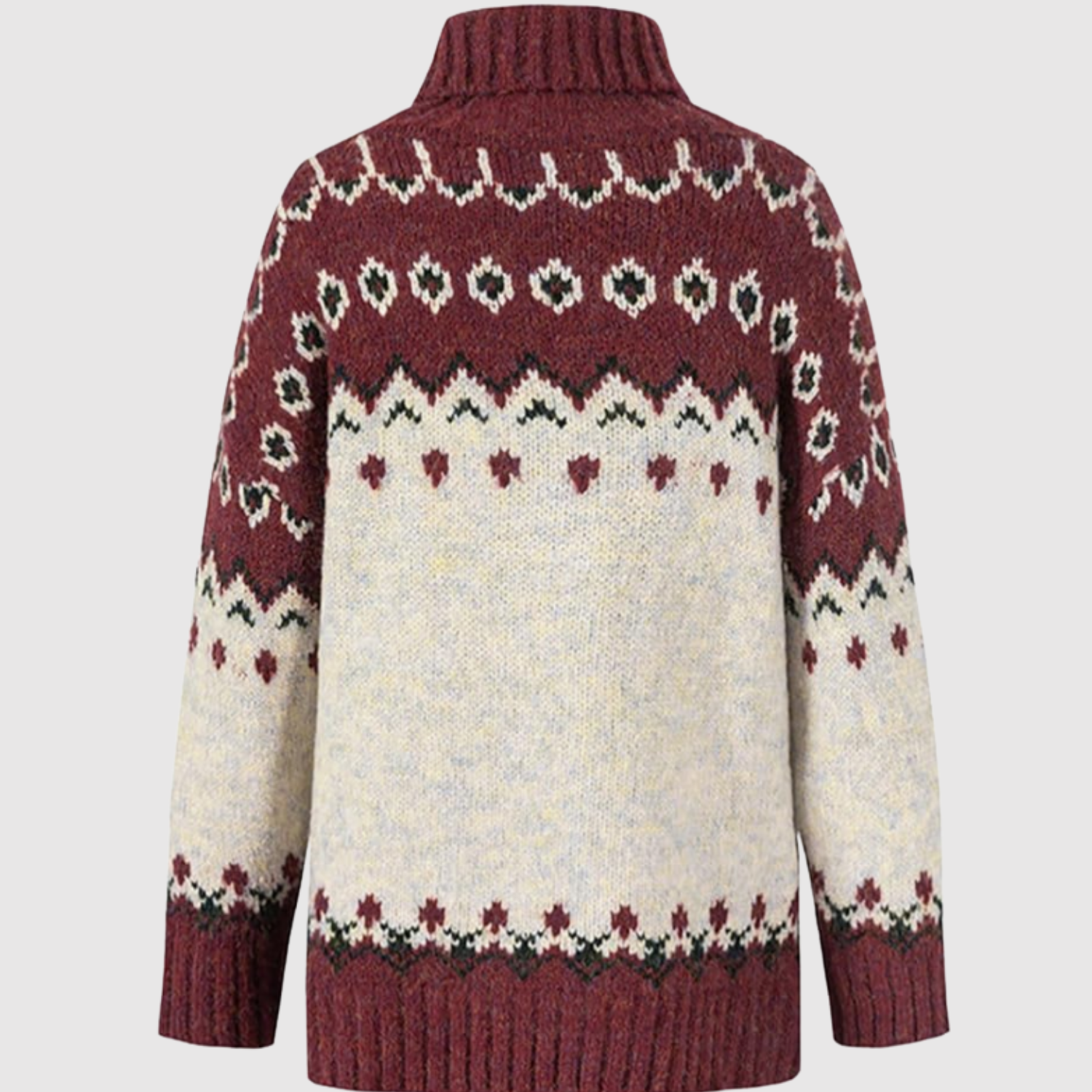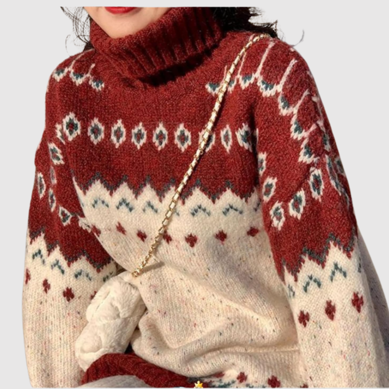 Ten sweter inspirowany jest tradycyjnymi norweskimi dzianinami, które łączą ciepło, komfort i elegancję. Wykonany z miękkiej przędzy z wysokim kołnierzem i pięknym wzorem w czerwieni i beżu, jest idealny na chłodne dni. Dodaje odrobinę świątecznego uroku każdemu strojowi.