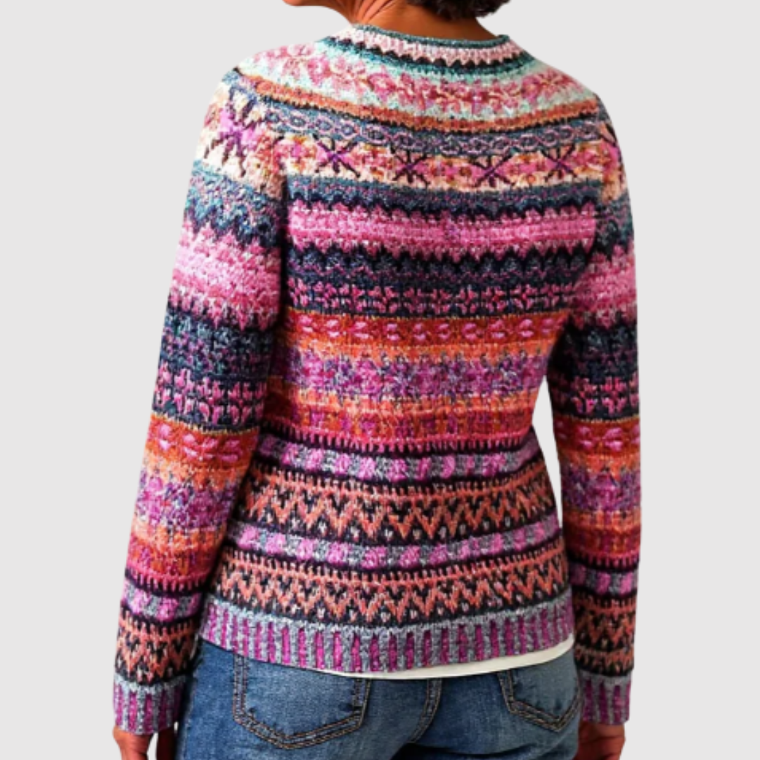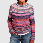 Ten sweter zachwyca swoją unikalną kombinacją kolorów i miękkiego, przytulnego splotu. Perfekcyjny wybór na jesienne i zimowe dni, zapewnia komfort i dodaje odrobinę artystycznego uroku każdemu wyglądowi. Wykonany z wysokiej jakości włóczki, która zapewnia ciepło i przyjemny kontakt ze skórą.
