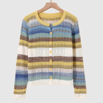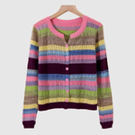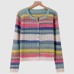 Lekki i świeży kardigan w wielokolorowym dzianinie z poziomymi paskami. Klasyczne zapięcie na guziki ułatwia stylizację, podczas gdy żywe kombinacje kolorów nadają nowoczesny i unikalny wygląd. Idealny na codzienne noszenie i nieformalne okazje.