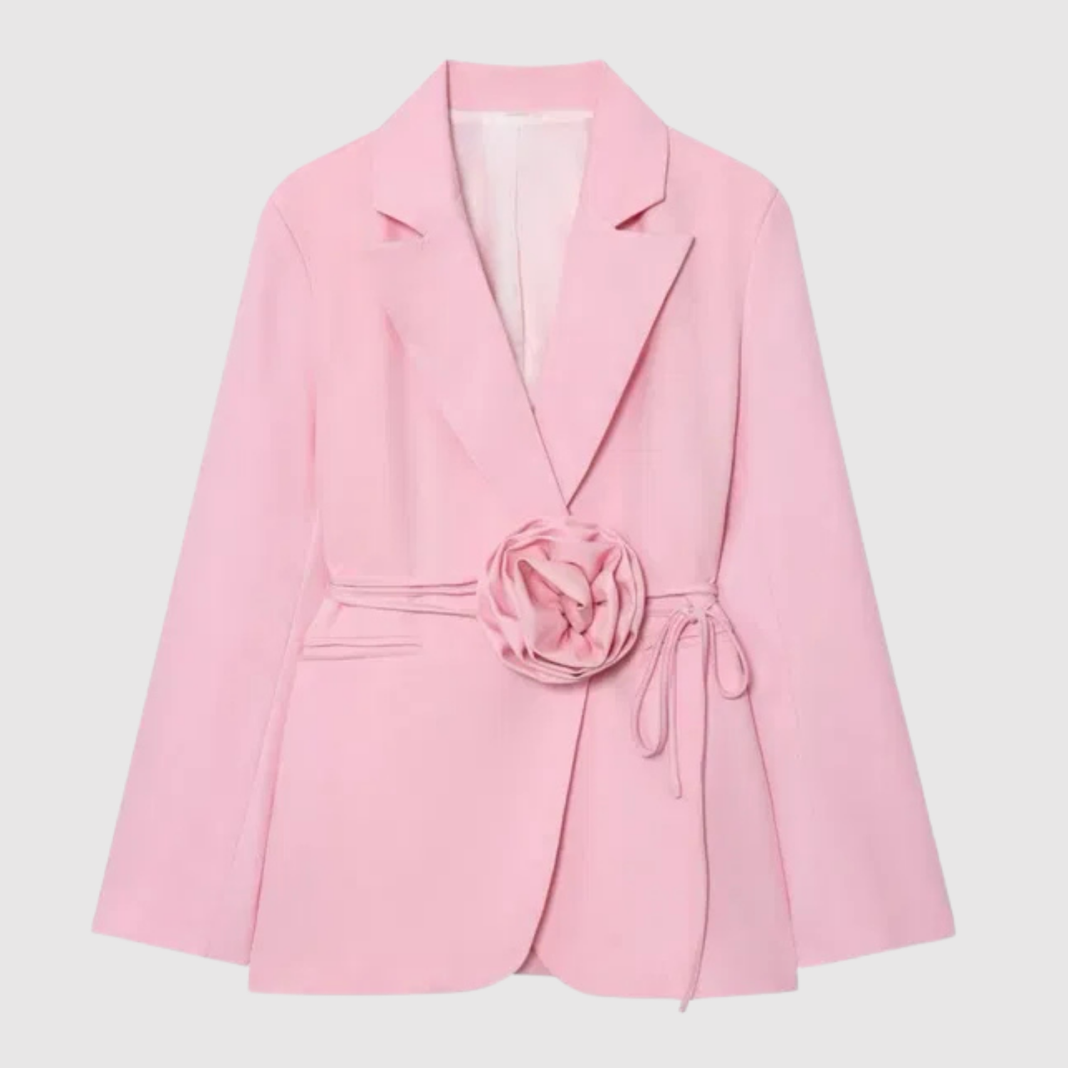 Ten żakiet łączy klasyczną elegancję z unikalnym kolorowym detalem w pasie. Sylwetka jest dopasowana, co tworzy wyrafinowany wygląd, idealny na formalne i uroczyste okazje.