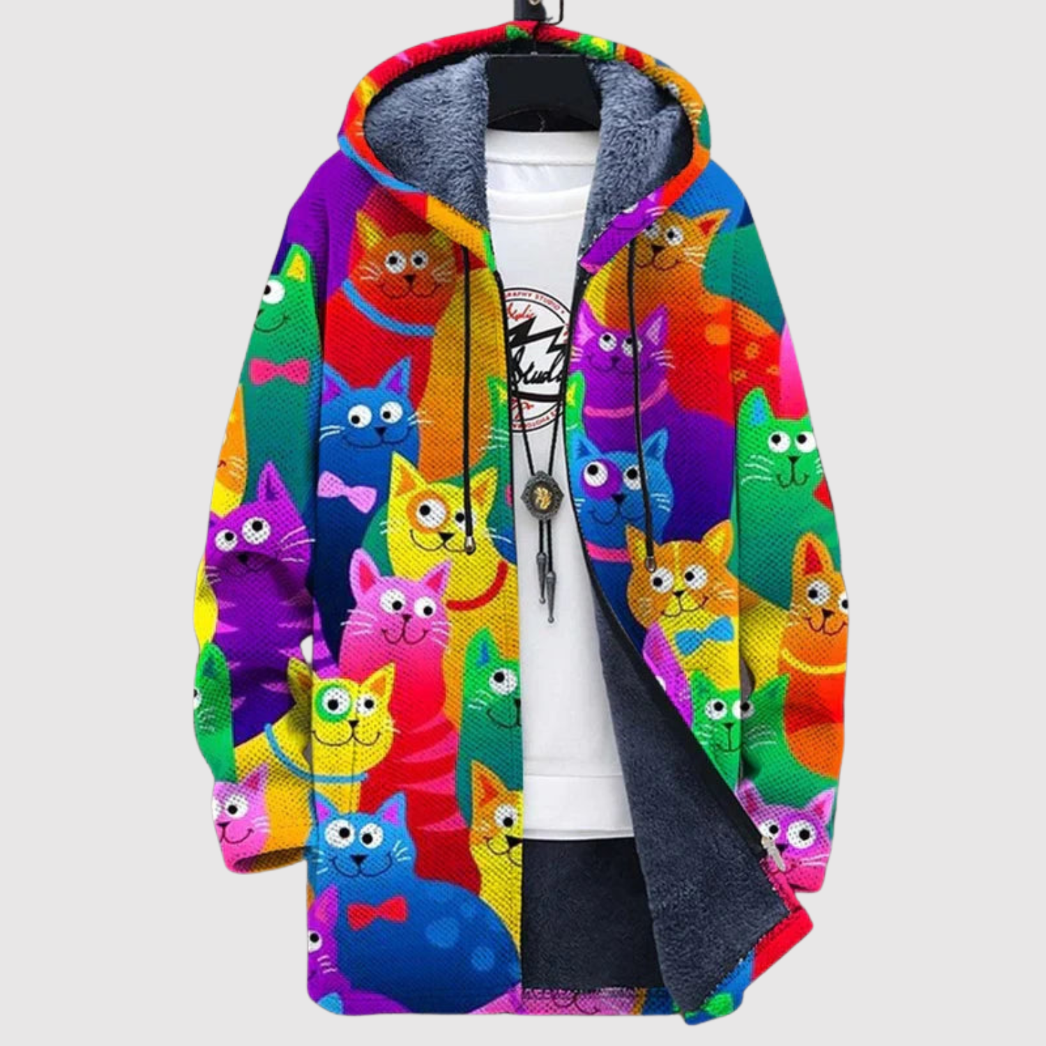 Ta bluza wprowadza kolor i humor do codziennego życia dzięki swojemu kolorowemu motywowi kotów. Miękka, ciepła podszewka zapewnia maksymalny komfort, podczas gdy zabawny design nadaje unikalny i wesoły wygląd.