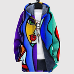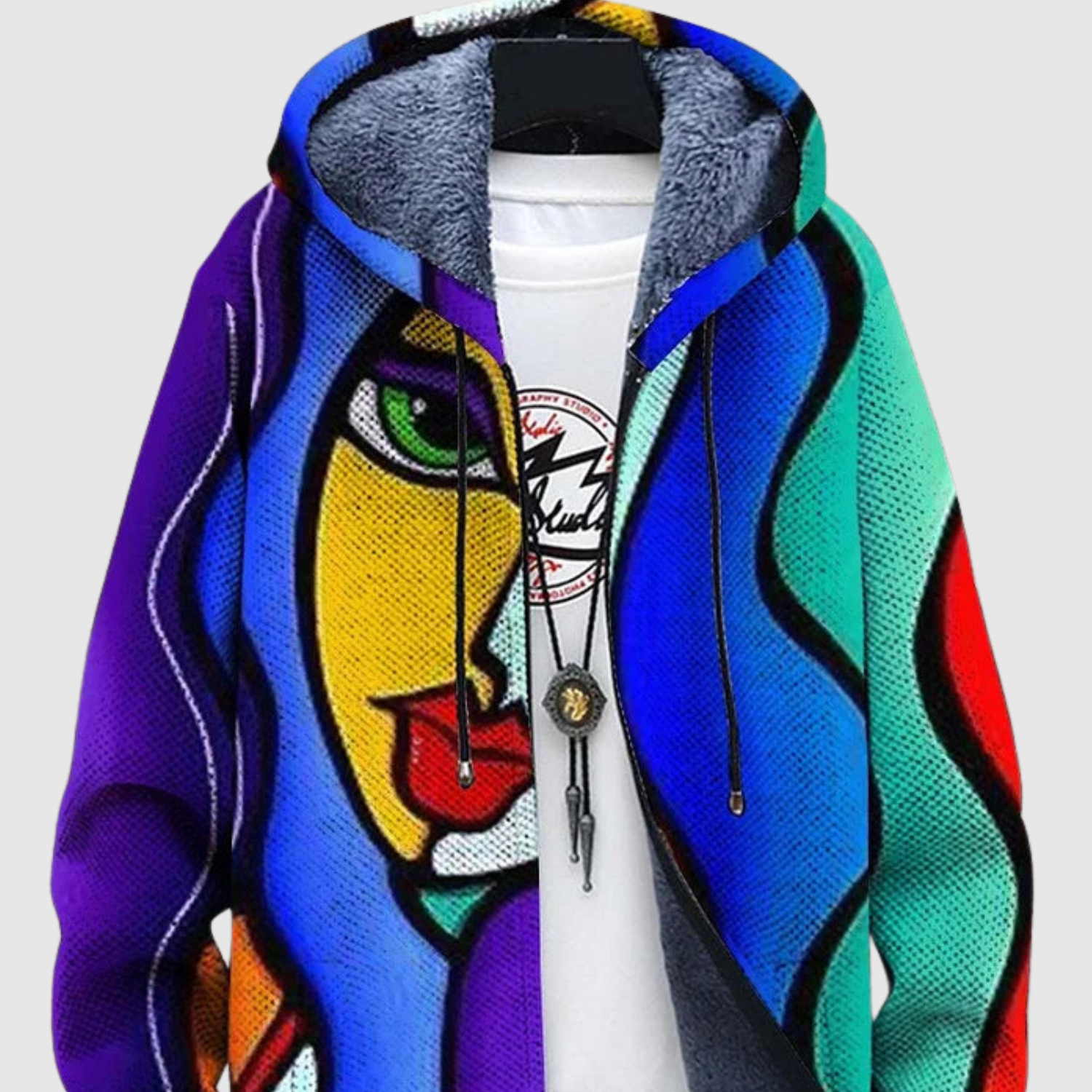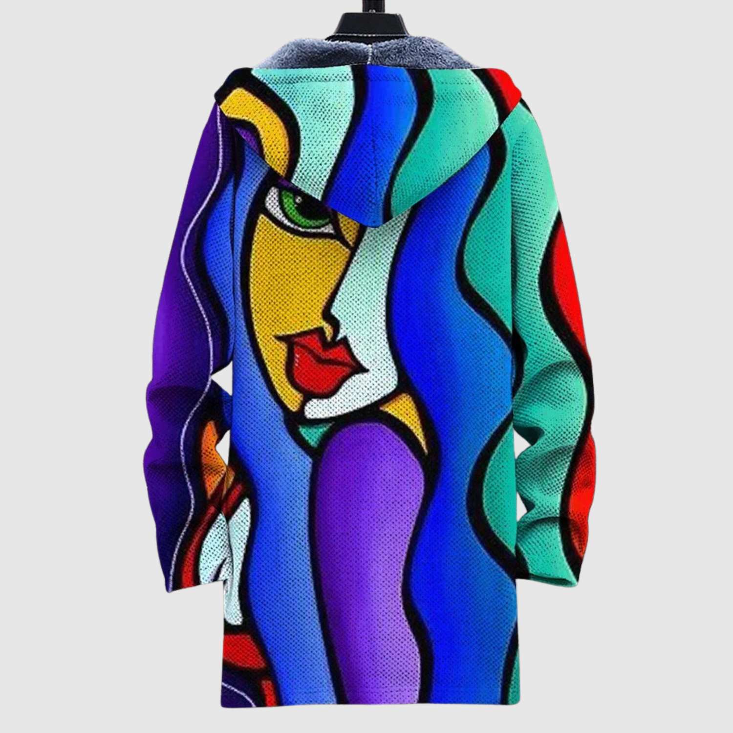 Ta bluza łączy intensywne kolory i artystyczne kształty w abstrakcyjnym przedstawieniu twarzy, które emanuje osobowością i wolnością. Miękka, ciepła podszewka sprawia, że jest idealna do codziennego noszenia i relaksujących chwil w stylu.