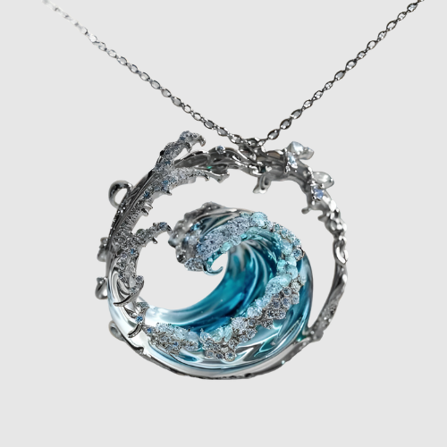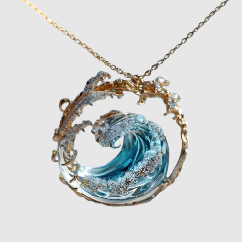 Ten unikalny naszyjnik uchwyca piękno i ruch morza w eleganckiej złotej lub srebrnej ramie. Symbol wolności, spokoju i wewnętrznej równowagi.