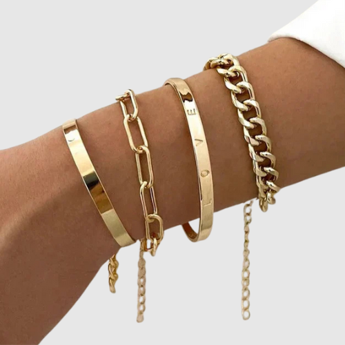 • Cztery różne bransoletki – łączą gładkie, łańcuszkowe i otwarte wzory