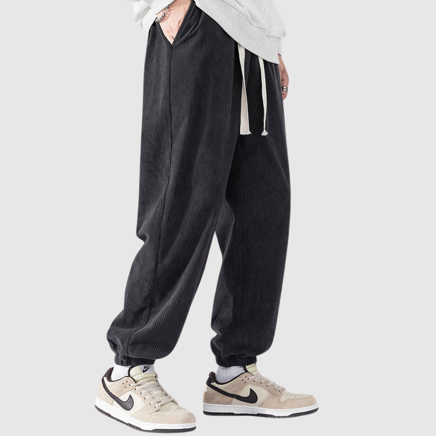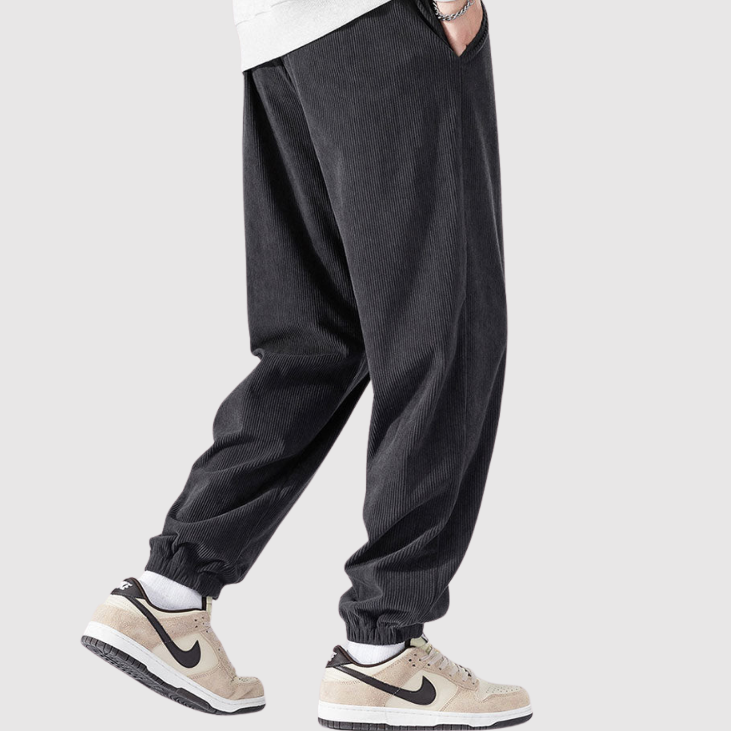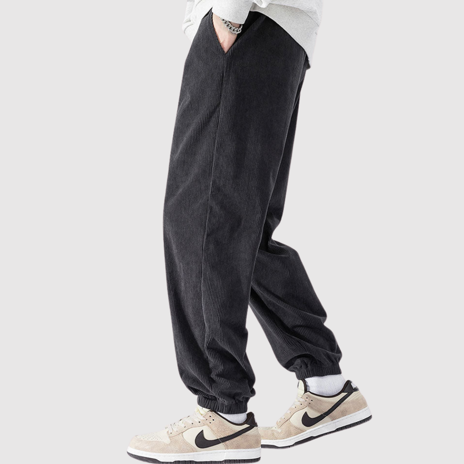 Te spodnie cargo z weluru łączą nowoczesny wyraz z miękką teksturą. Materiał zapewnia zarówno komfort, jak i trwałość, podczas gdy elastyczny pas gwarantuje elastyczny krój do codziennego noszenia.