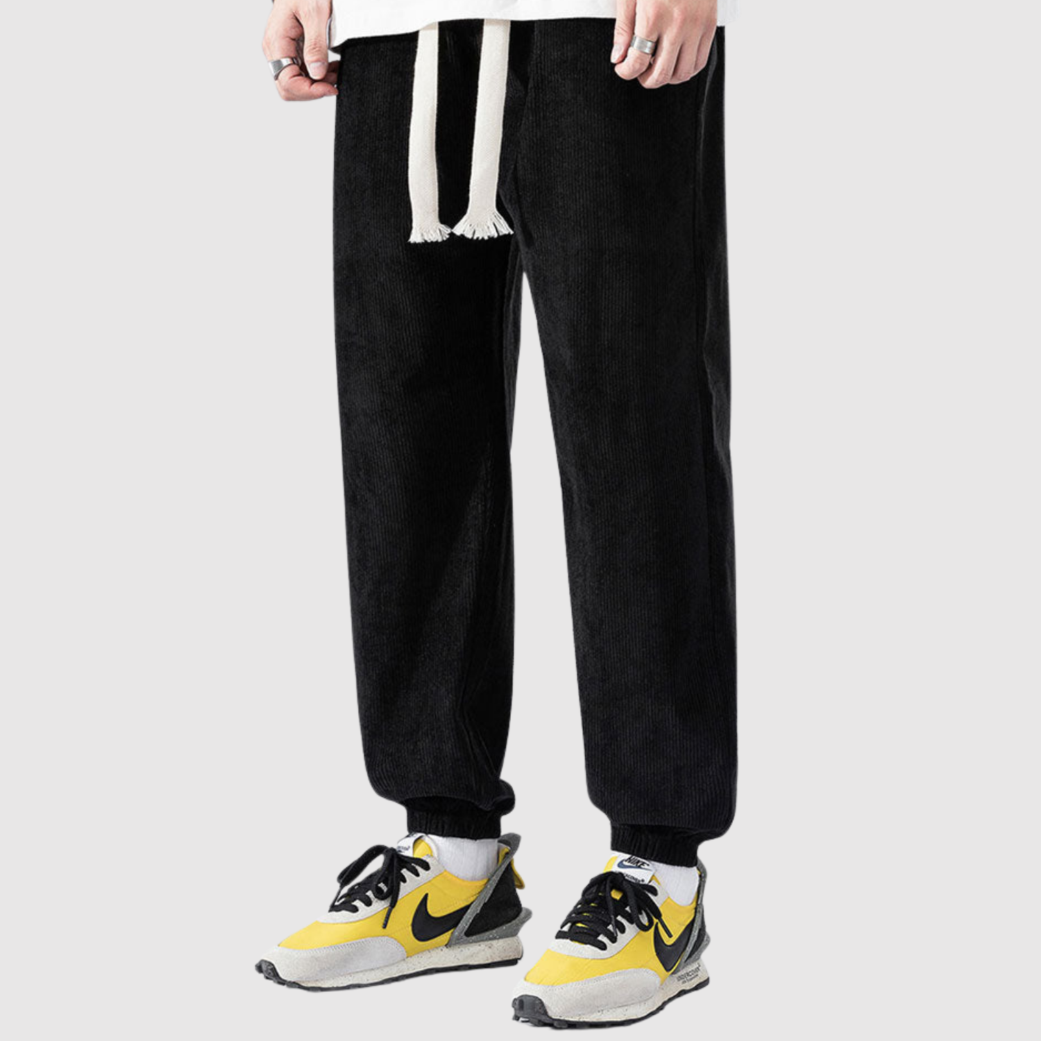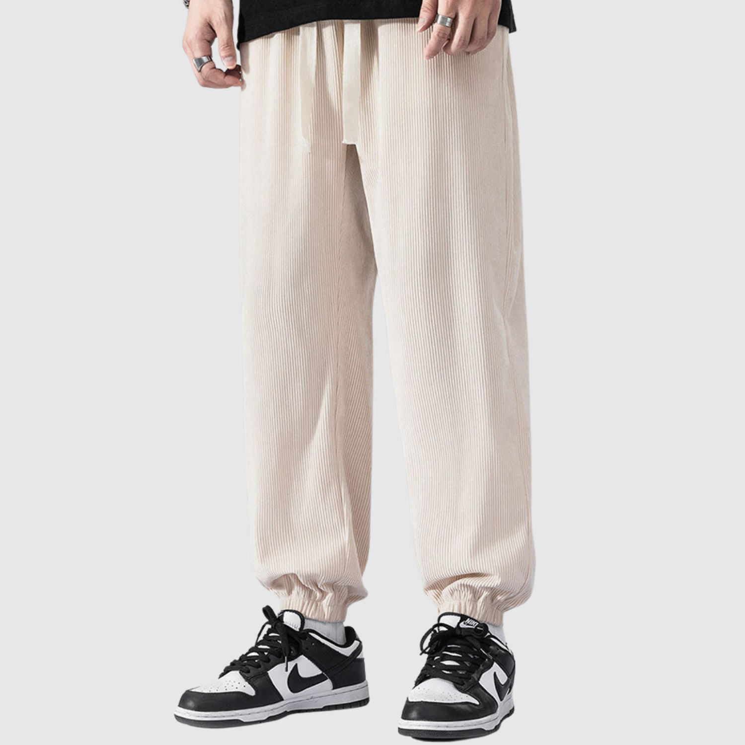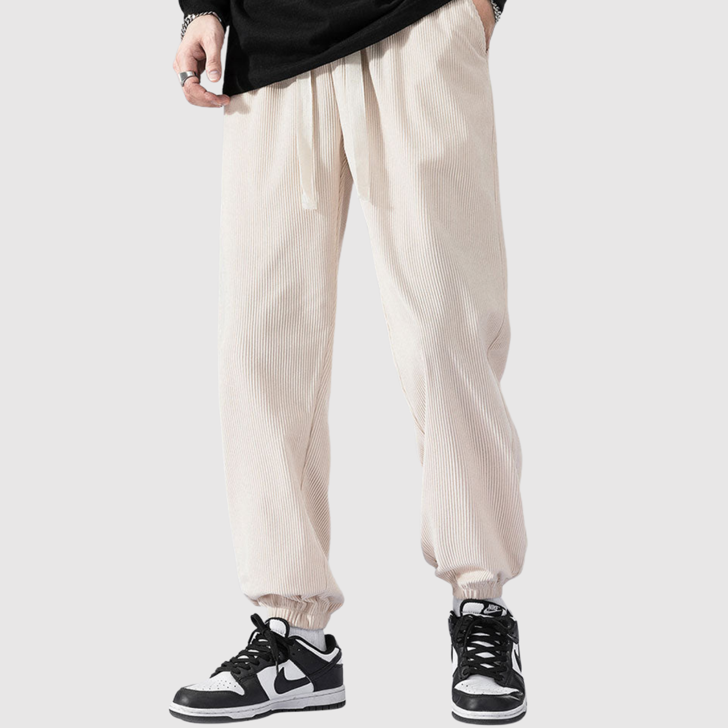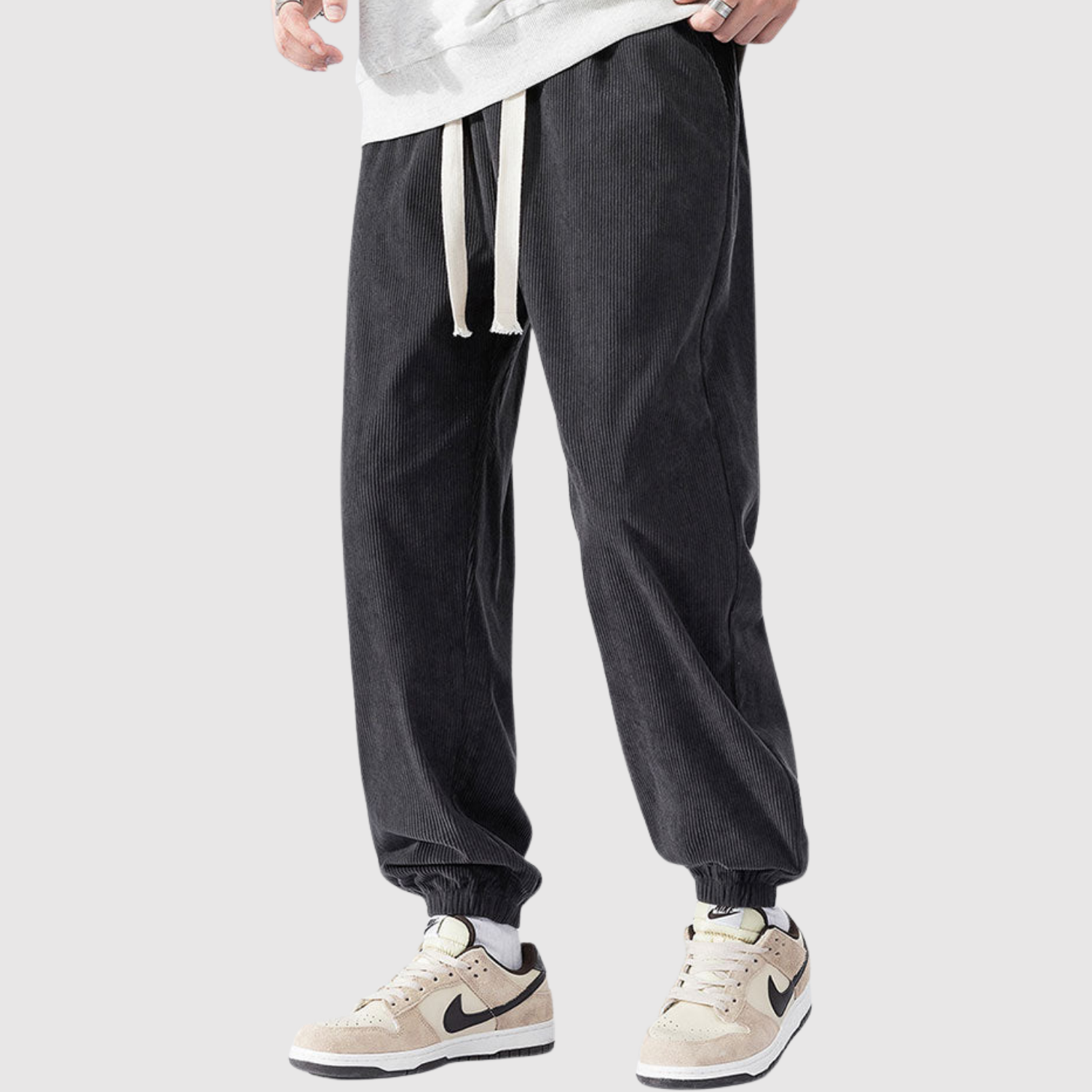 Te spodnie cargo z weluru łączą nowoczesny wyraz z miękką teksturą. Materiał zapewnia zarówno komfort, jak i trwałość, podczas gdy elastyczny pas gwarantuje elastyczny krój do codziennego noszenia.