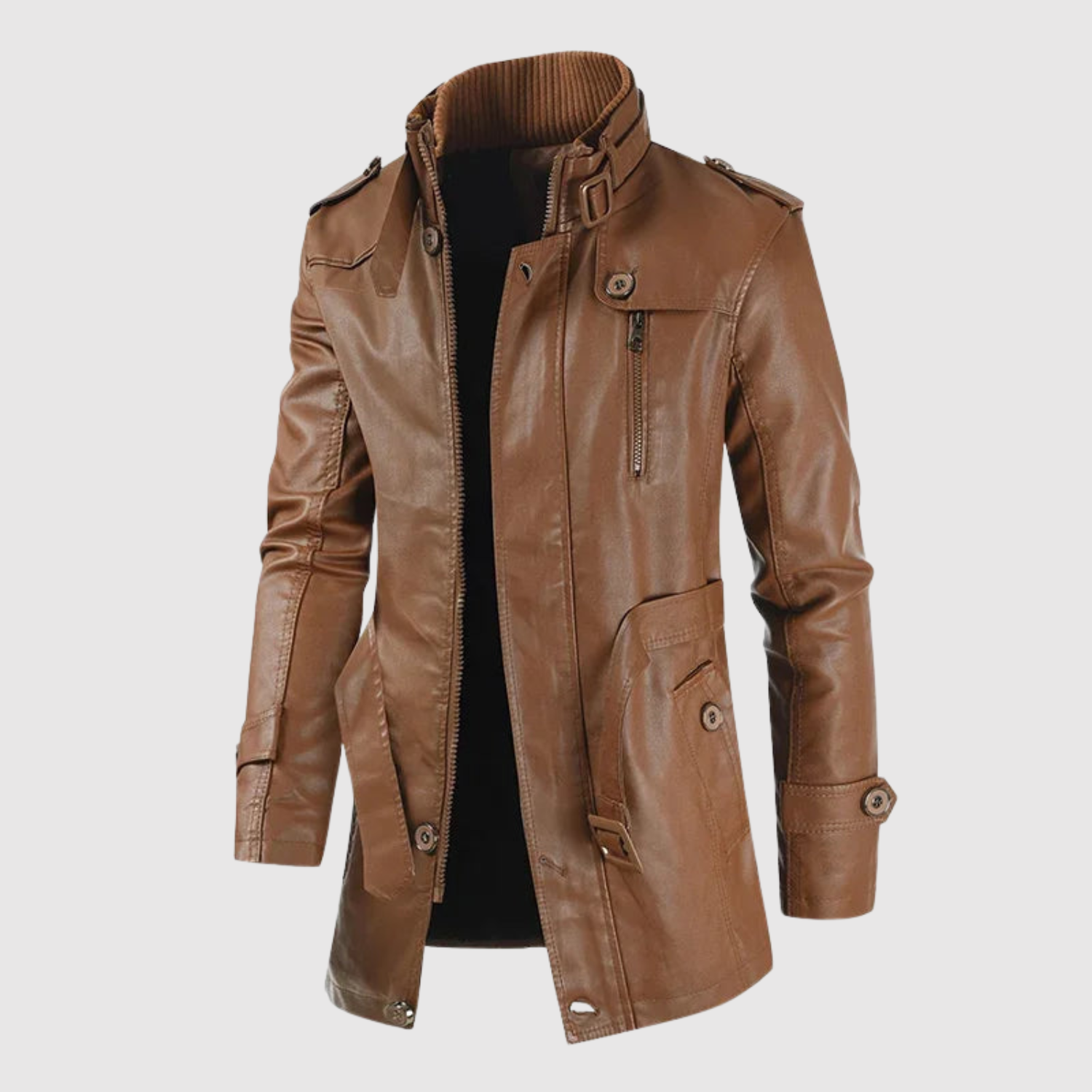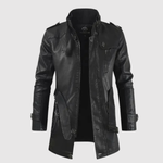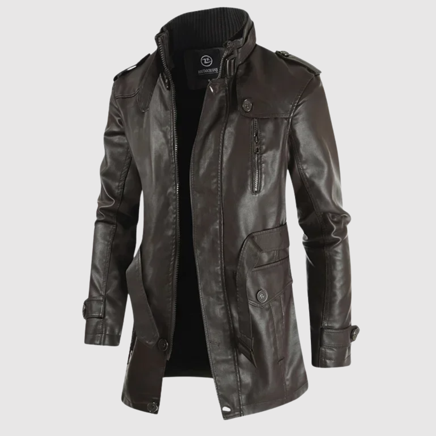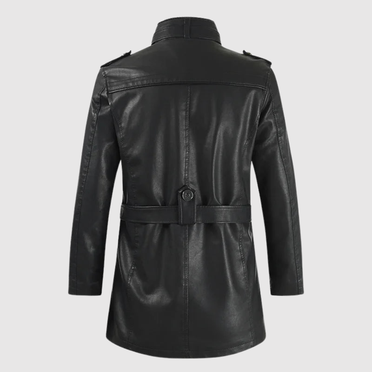 Dorian – Długa skórzana kurtka z wysokim kołnierzem