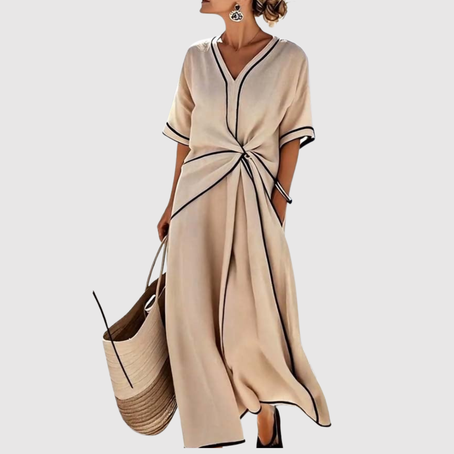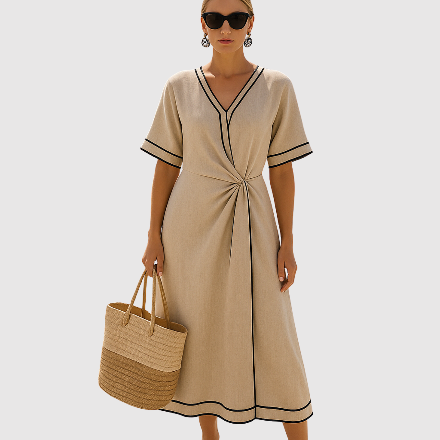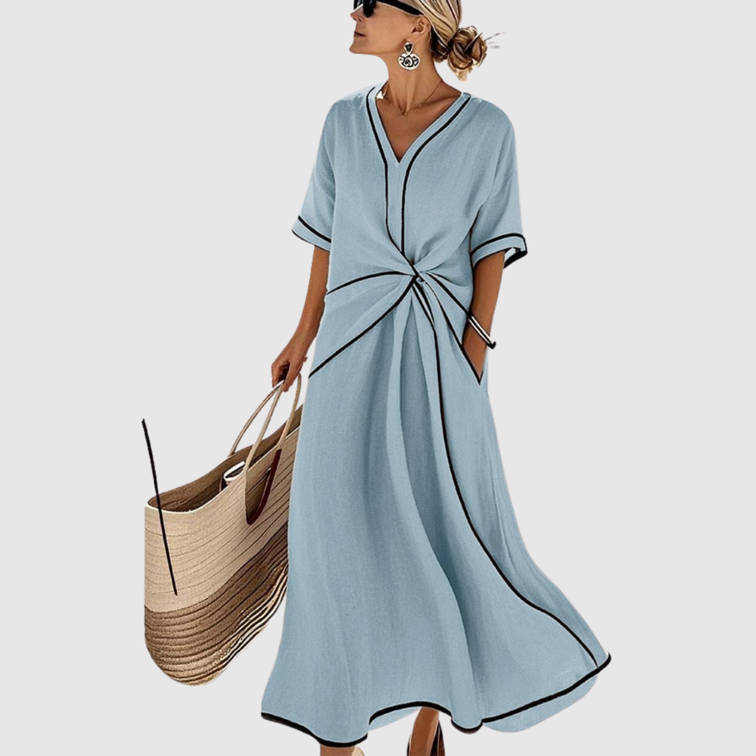 Te sukienki są uosobieniem świeżości i letniego stylu. Z lekką i płynną sylwetką, która zapewnia pełną swobodę ruchu, cechują się elegancką boczną kokardą, która podkreśla sylwetkę, oraz kontrastowymi brzegami, które nadają nowoczesny wygląd. Idealne na spacery, wakacje lub nieformalne spotkania – uniwersalne sukienki, które łączą komfort i elegancję w jednym rozwiązaniu projektowym.