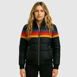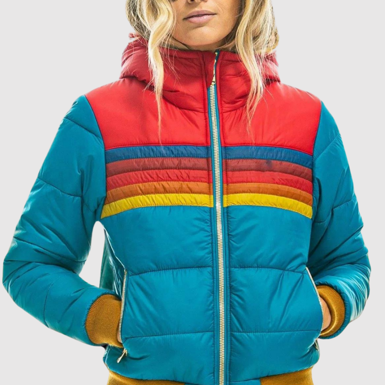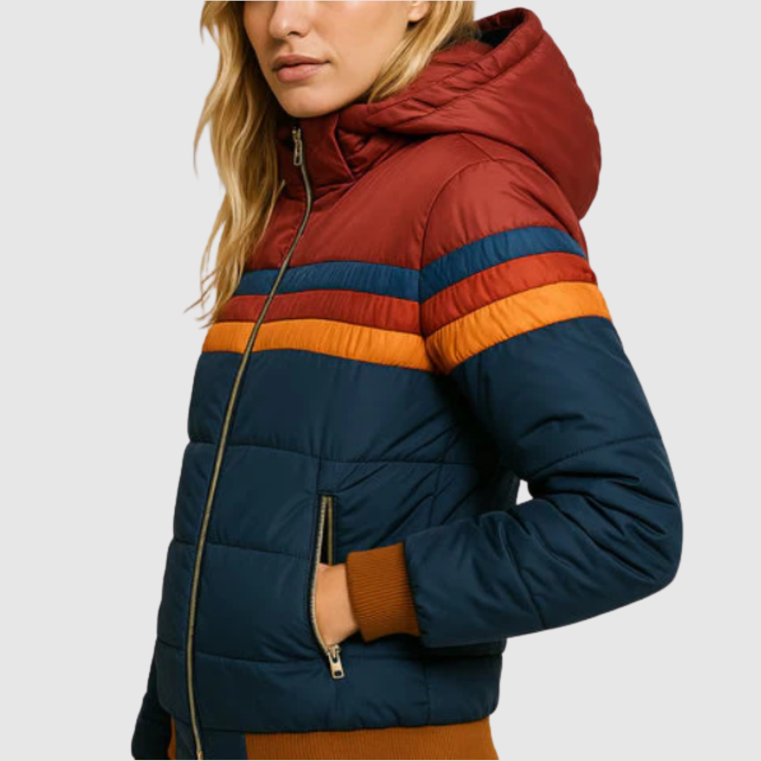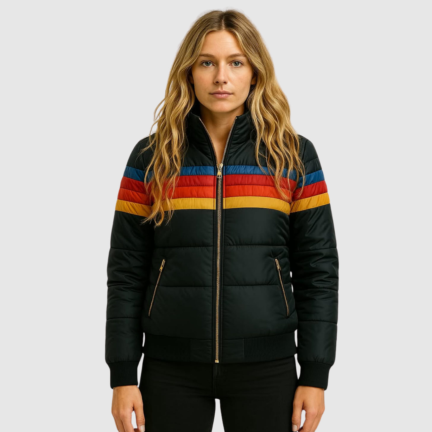 Ta kurtka łączy sportową inspirację z ciepłym, podszewkowym designem. Kolorowe paski nadają jej unikalny retro wygląd, podczas gdy miękka izolacja chroni przed zimnem. Idealny wybór na codzienne noszenie oraz na aktywności na świeżym powietrzu w okresie przejściowym i zimowym.