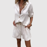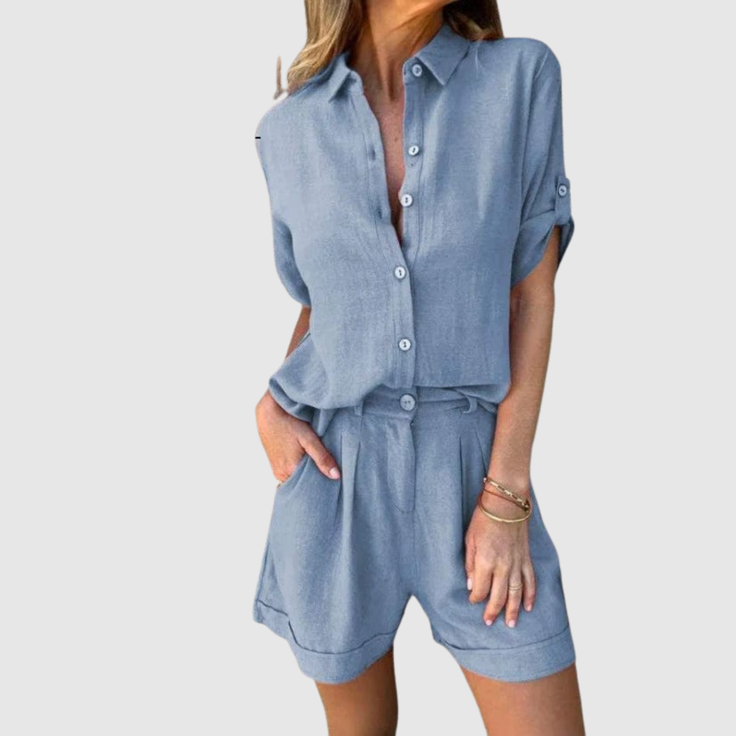 Lekki i przewiewny komplet, składający się z luźno stojącej koszuli i pasujących szortów. Zaprojektowany na gorące dni, kiedy komfort i styl idą w parze. Idealny zarówno na plażę, jak i na wieczorny spacer czy relaksujący dzień w domu.