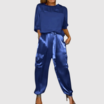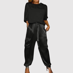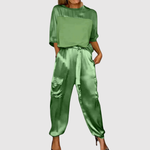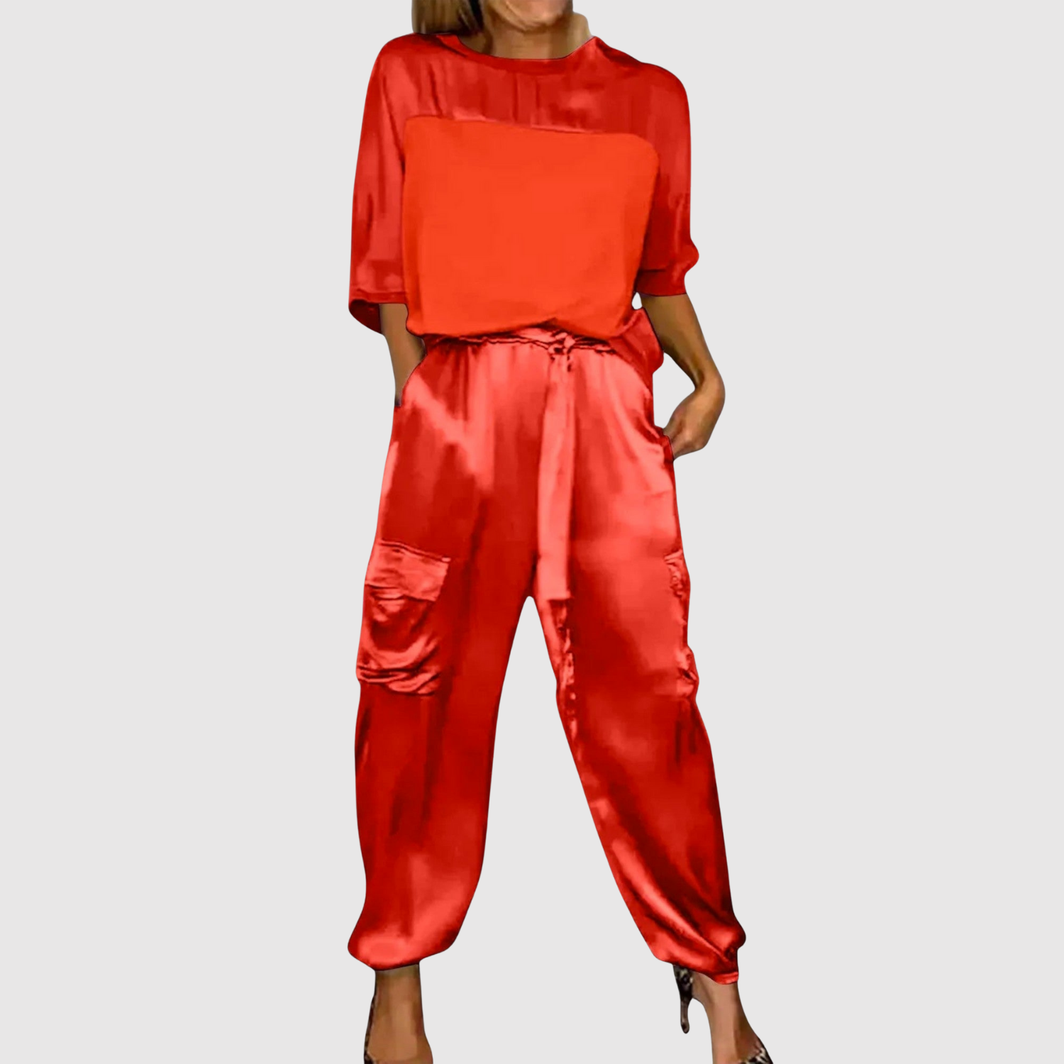 Nowoczesny dwuczęściowy komplet z gładkiego satynu, który łączy luksus z casualową elegancją. Lekka, błyszcząca powierzchnia sprawia, że ten strój jest idealny zarówno na uroczyste okazje, jak i na codzienne noszenie ze stylem.