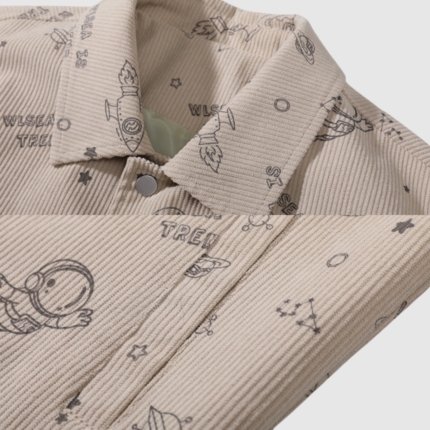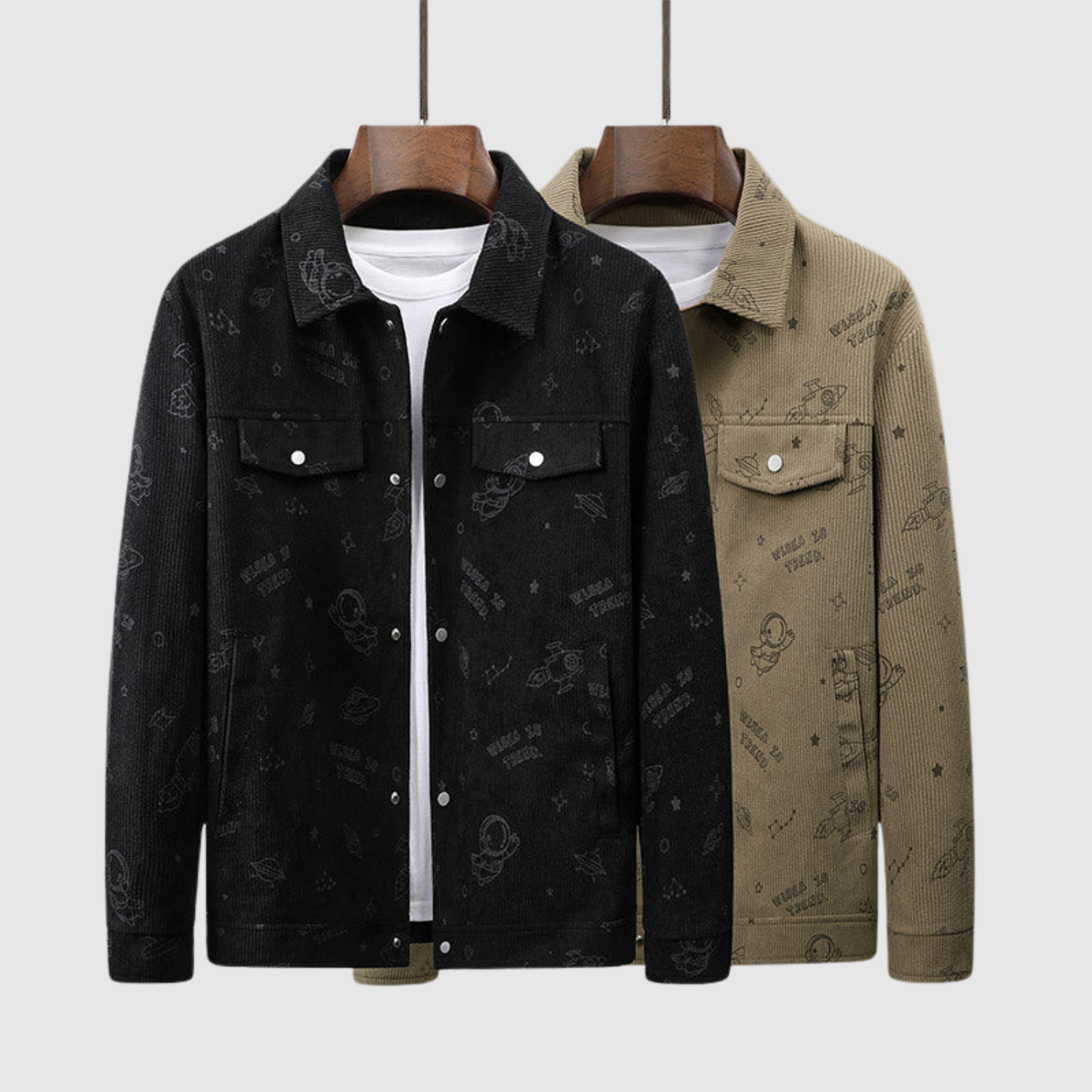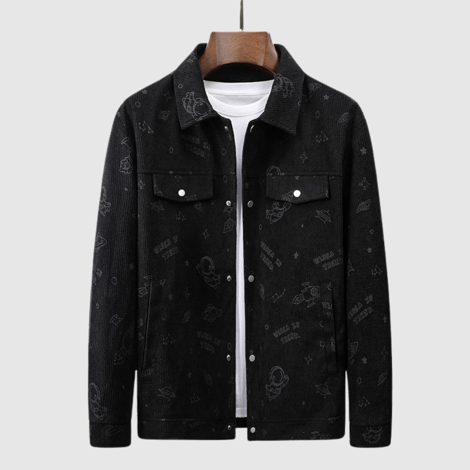 Kurtka Stellar wykonana jest z miękkiego, delikatnie strukturalnego aksamitu i ozdobiona motywami inspirowanymi kosmosem, co nadaje jej imponujący wygląd. Praktyczne kieszenie na piersi, solidne guziki i uniwersalna waga sprawiają, że jest idealna do codziennego noszenia i warstwowania przez cały rok.