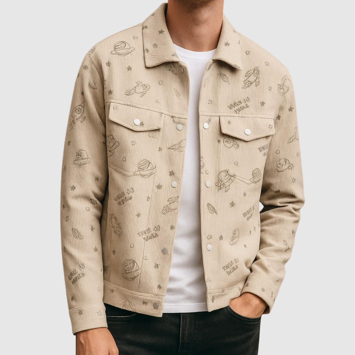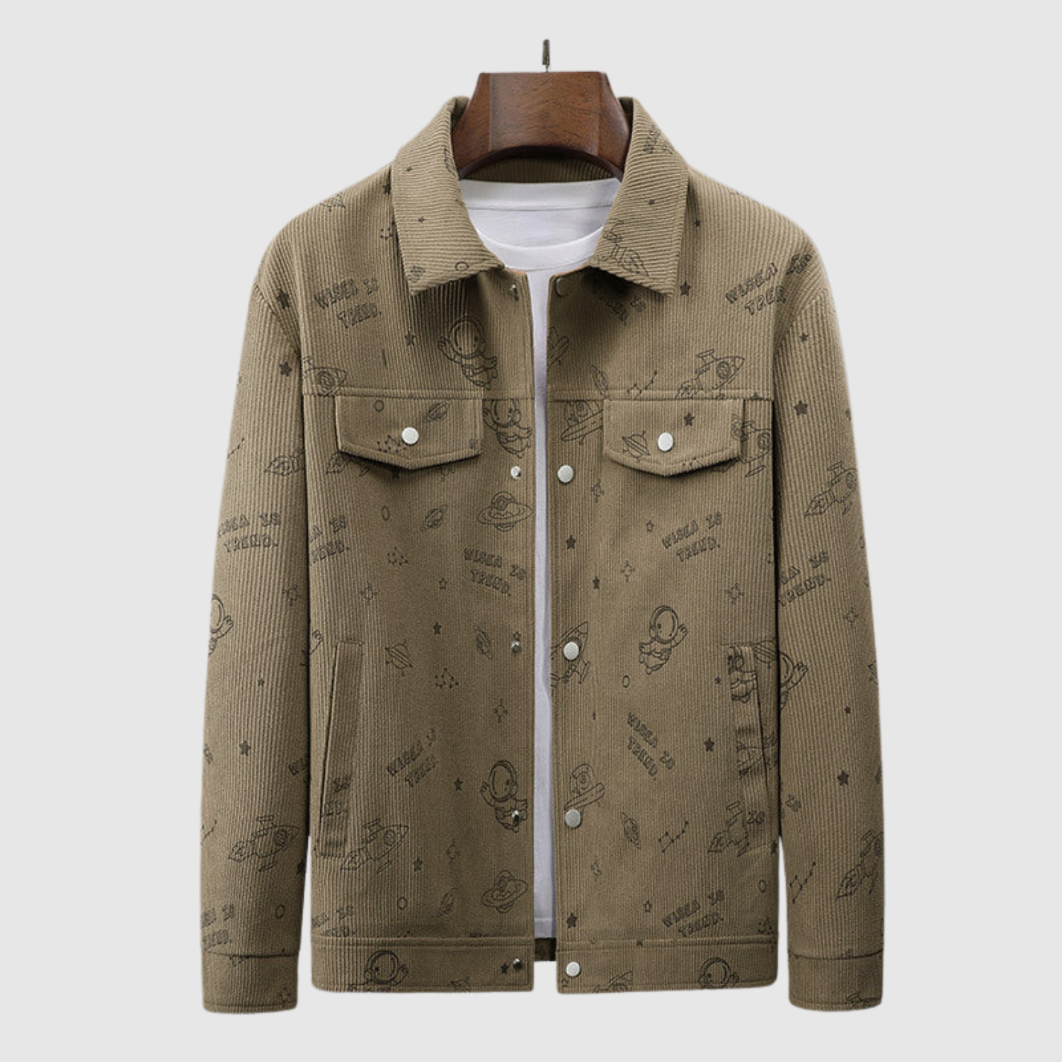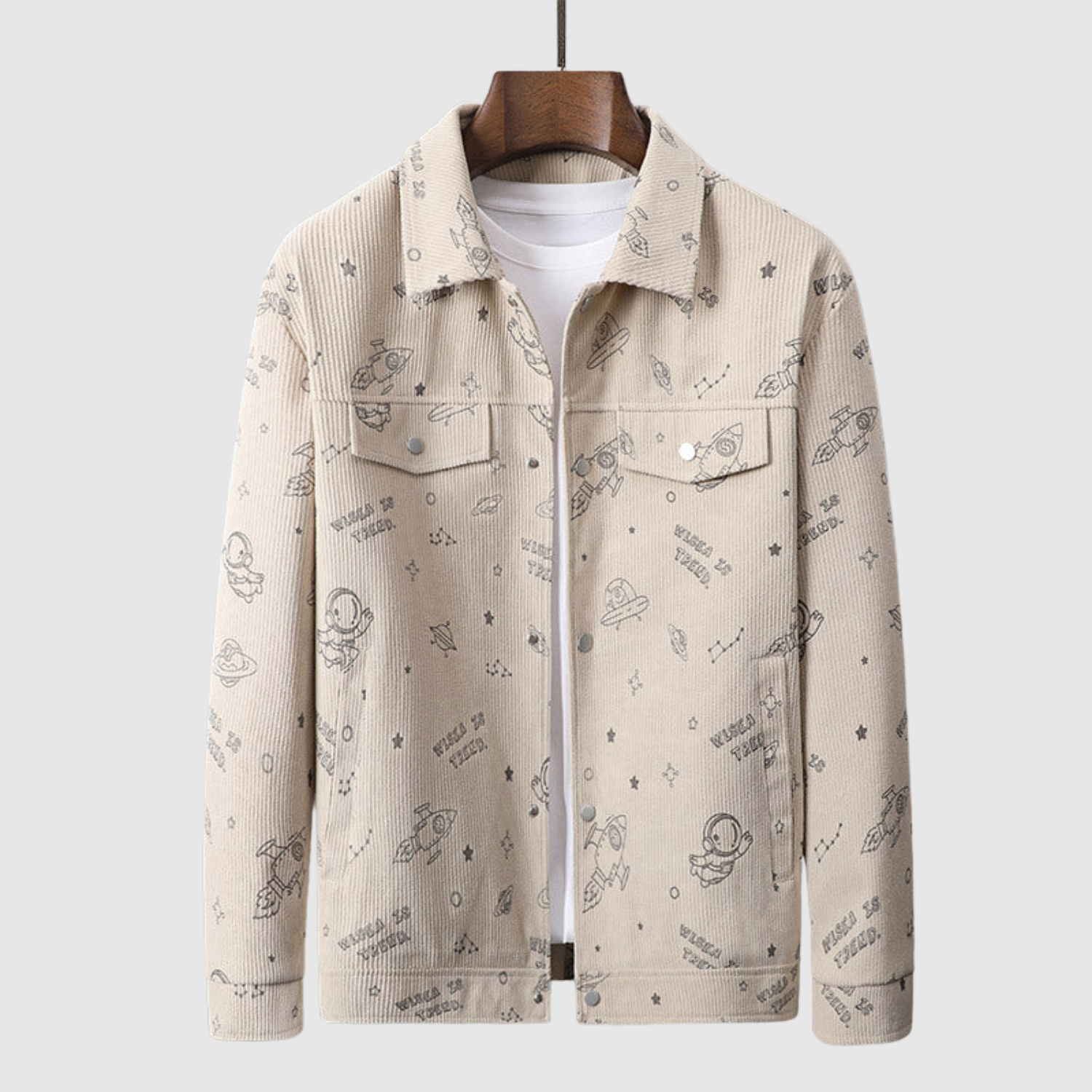 Kurtka Stellar wykonana jest z miękkiego, delikatnie strukturalnego aksamitu i ozdobiona motywami inspirowanymi kosmosem, co nadaje jej imponujący wygląd. Praktyczne kieszenie na piersi, solidne guziki i uniwersalna waga sprawiają, że jest idealna do codziennego noszenia i warstwowania przez cały rok.