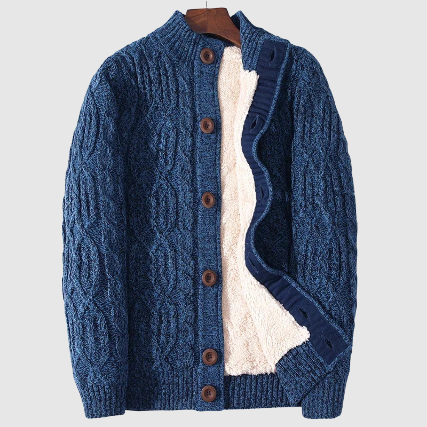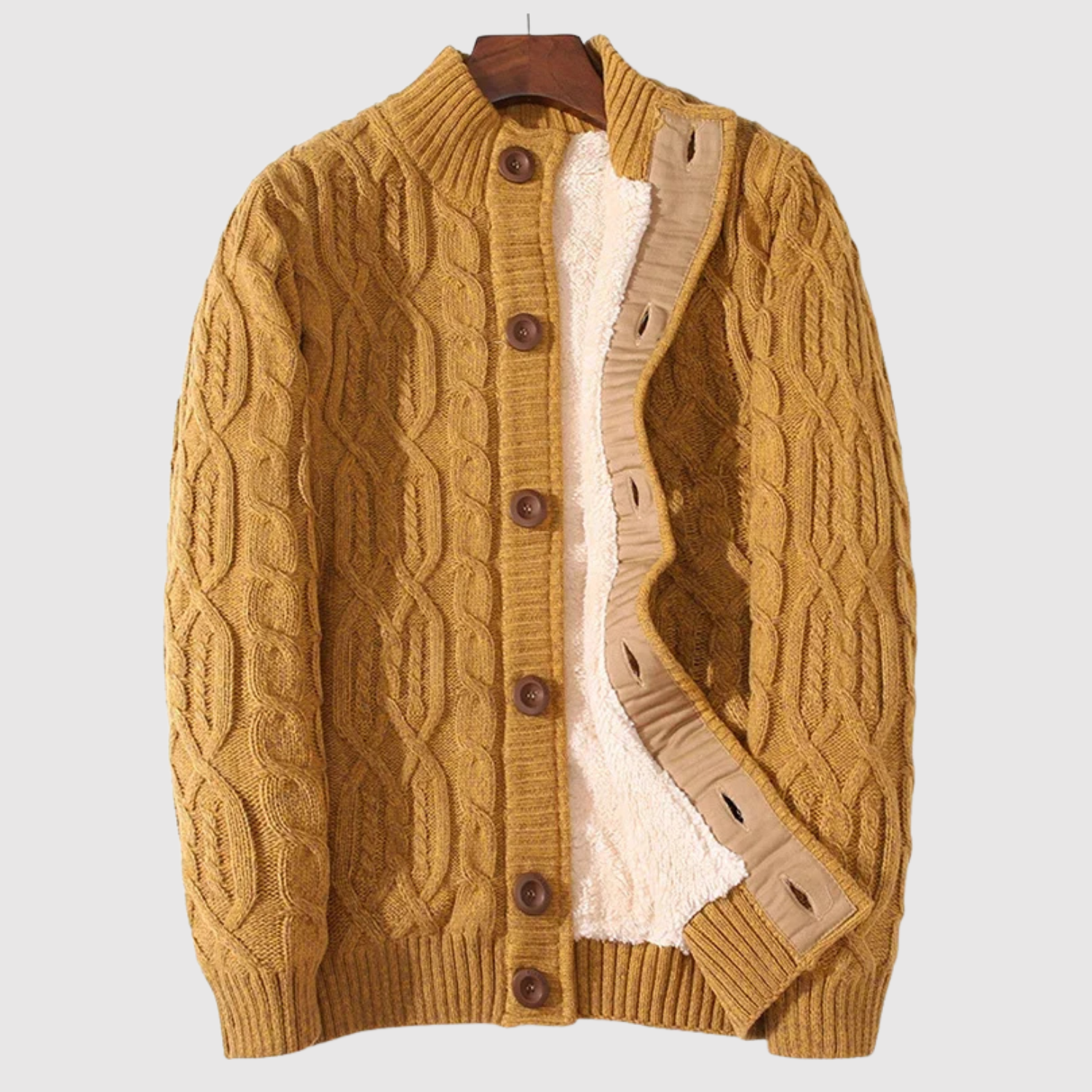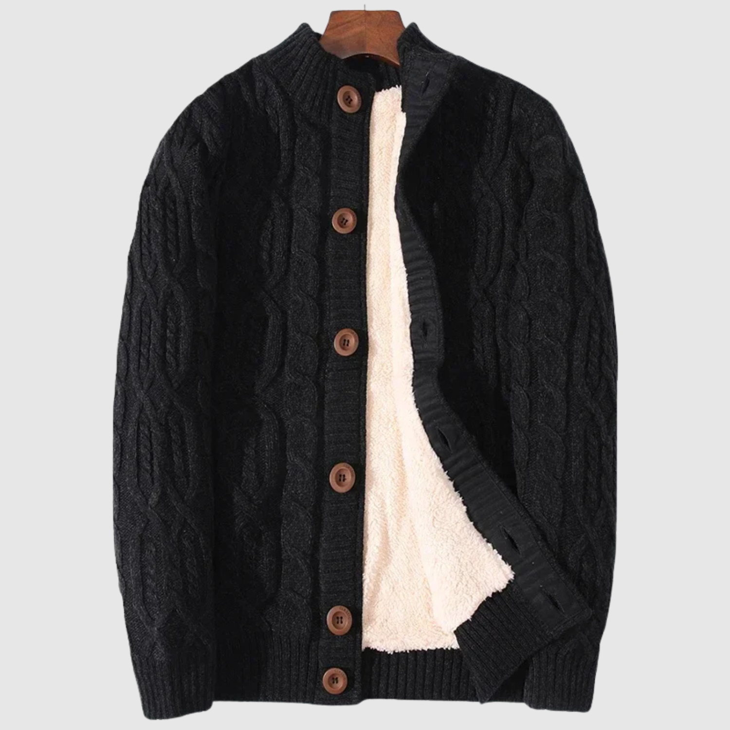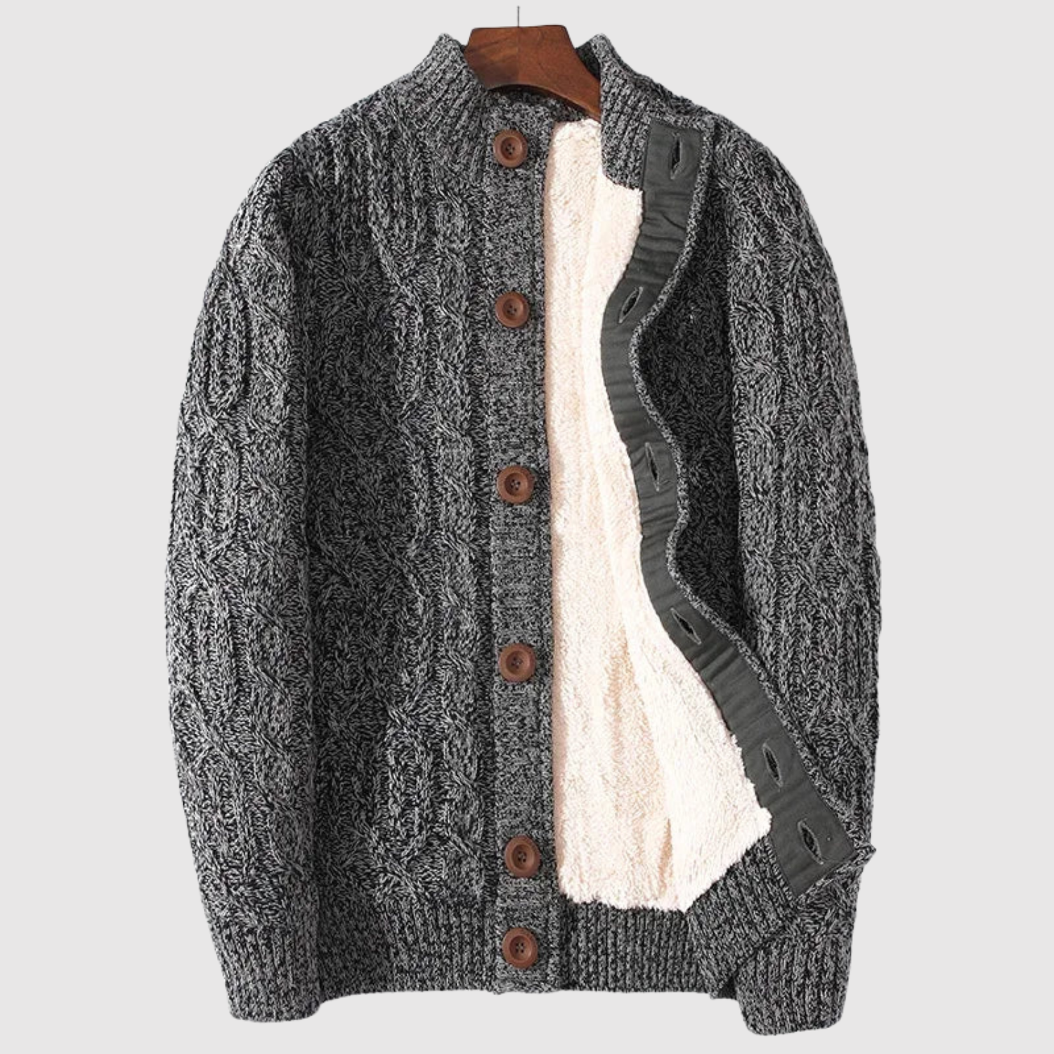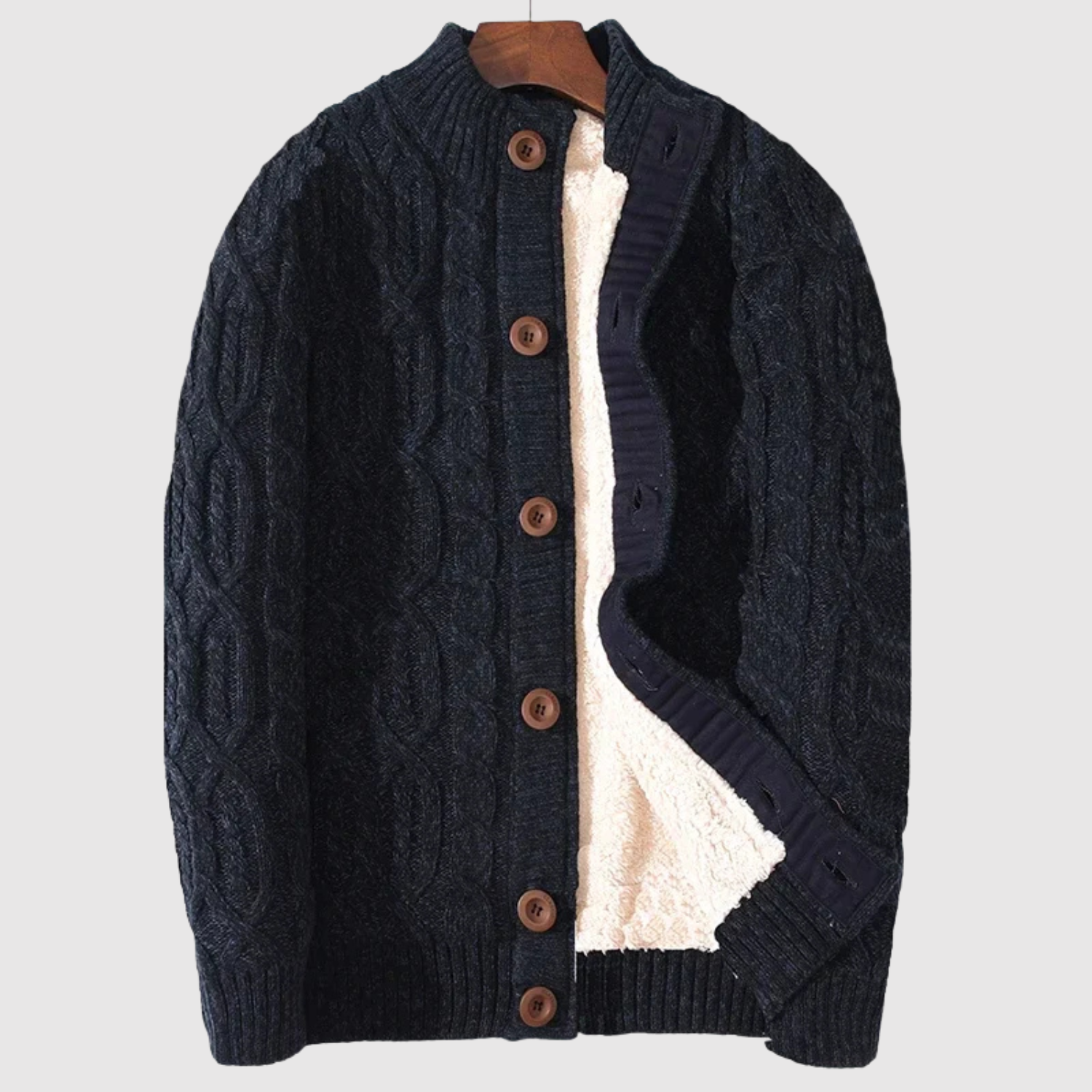 Ten pleciony kardigan łączy klasyczny splot warkoczowy z miękką podszewką dla maksymalnego komfortu. Z guzikami z przodu i ponadczasowym designem, jest idealny na codzienne noszenie i chłodne wieczory. To niezbędny element zimowej garderoby.