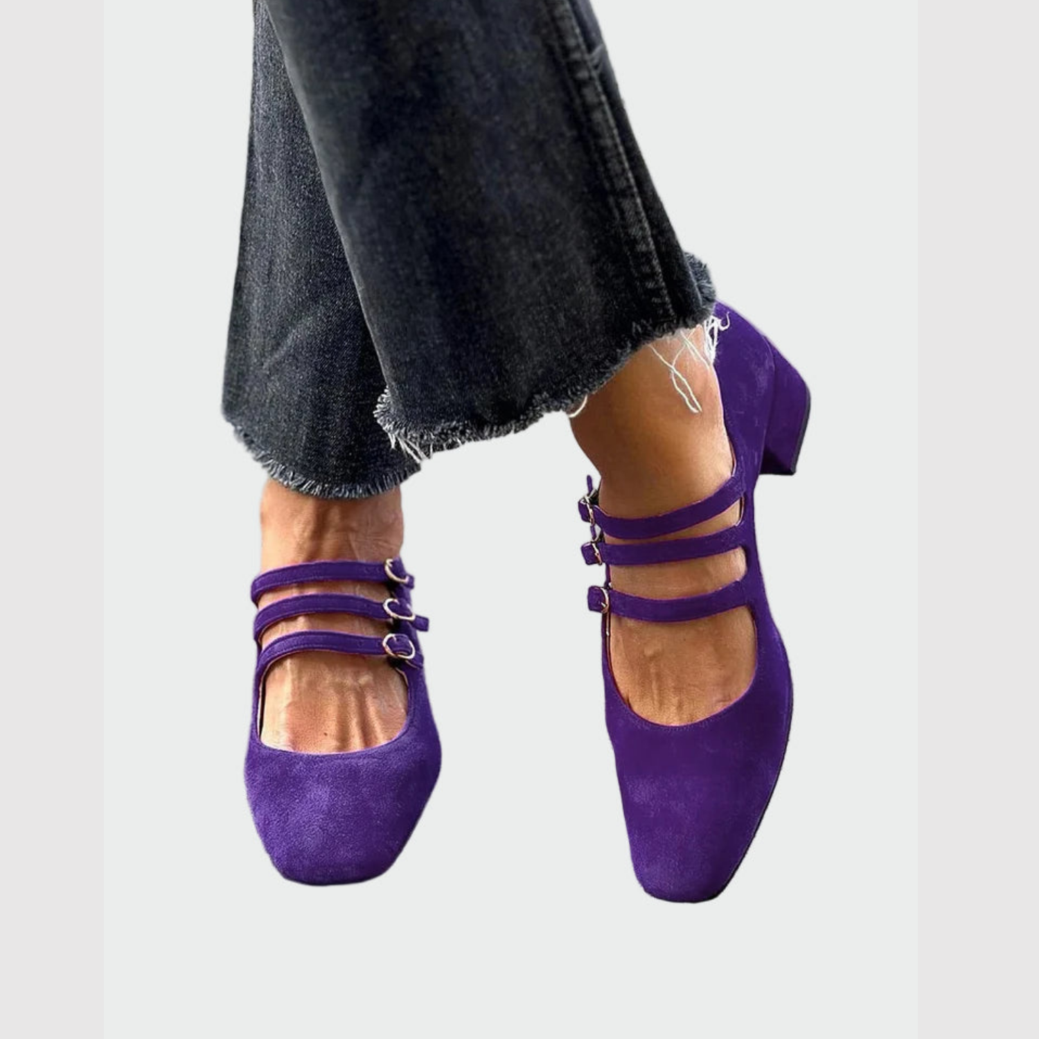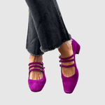 Te fioletowe baleriny z potrójnymi paskami łączą elegancję z zabawnym wyglądem. Kwadratowy czubek i niski obcas zapewniają stabilność i komfort przez cały dzień. Jasny kolor sprawia, że buty są stylowym oświadczeniem, które podnosi zarówno codzienne, jak i uroczyste stroje. Idealny wybór dla Ciebie, jeśli chcesz nowoczesny i unikalny detal w swojej garderobie.