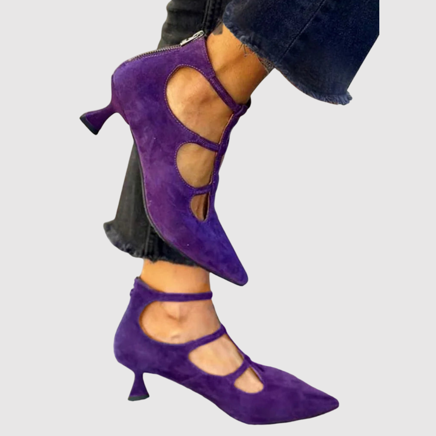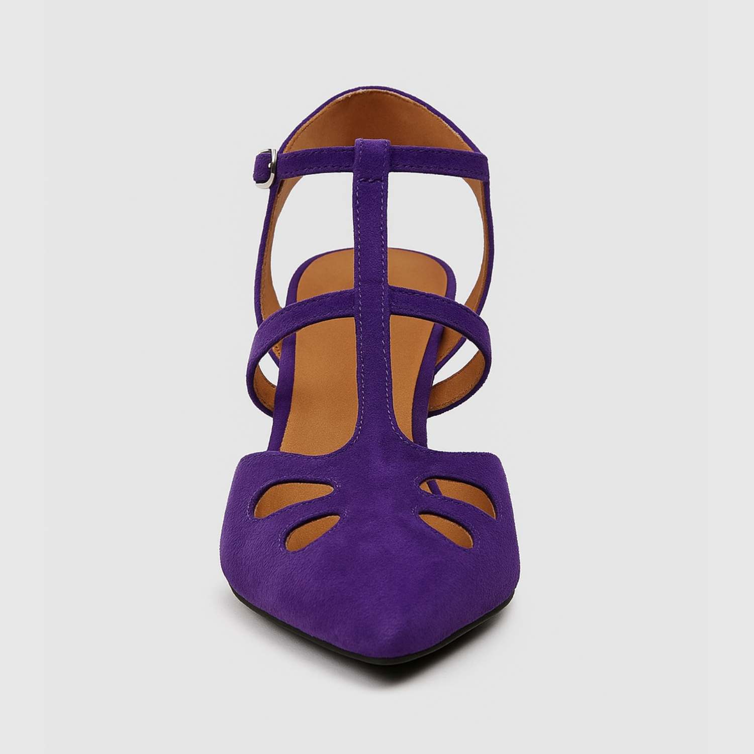 Te fioletowe szpilki łączą oszałamiającą paletę kolorów z eleganckimi detalami pasków. Niski obcas zapewnia komfort przez cały dzień, nie obniżając stylu, a design sprawia, że buty są idealne zarówno na co dzień, jak i do bardziej wymagających stylizacji.
